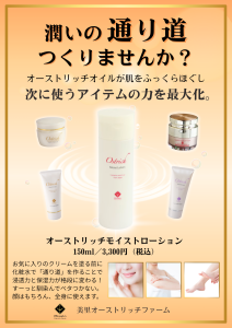 | 商品詳細 | 業界では珍しい『ダチョウ油』を0.9%配合した濃厚保湿ローション!とろりとしたテクスチャーの乳白化粧水が素早く肌になじみ、角質層のすみずみまで浸透し、ハリと潤いのある肌へと導きます。